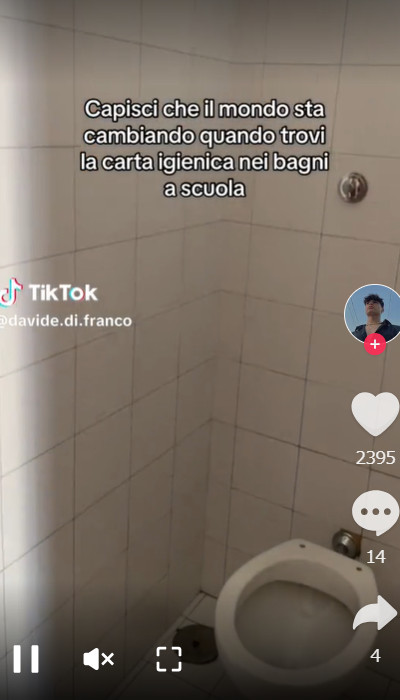 イタリアの高校生たちのTikTokでは、多くの学校でトイレットペーパーが不足していることについて冗談を言い、たまにトイレットペーパーの出現を「滅多にないこと“once in a blue moon”」として祝っています。