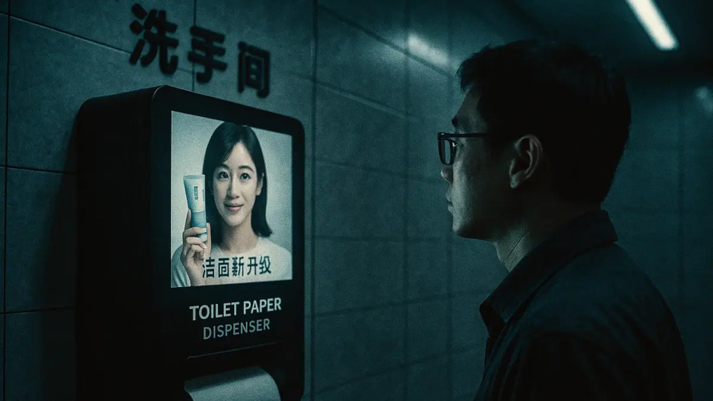 中国の公衆トイレでは、トイレットペーパー盗難が多いという理由で、お金を払うか、スマホで広告を見て無料ですませるかを選択しなければなりません。広告主はそうした数秒の注目に対して料金を支払います