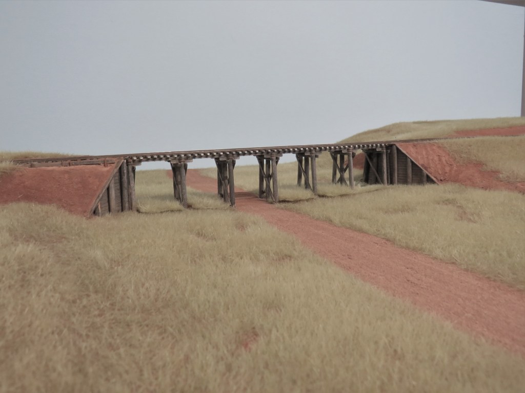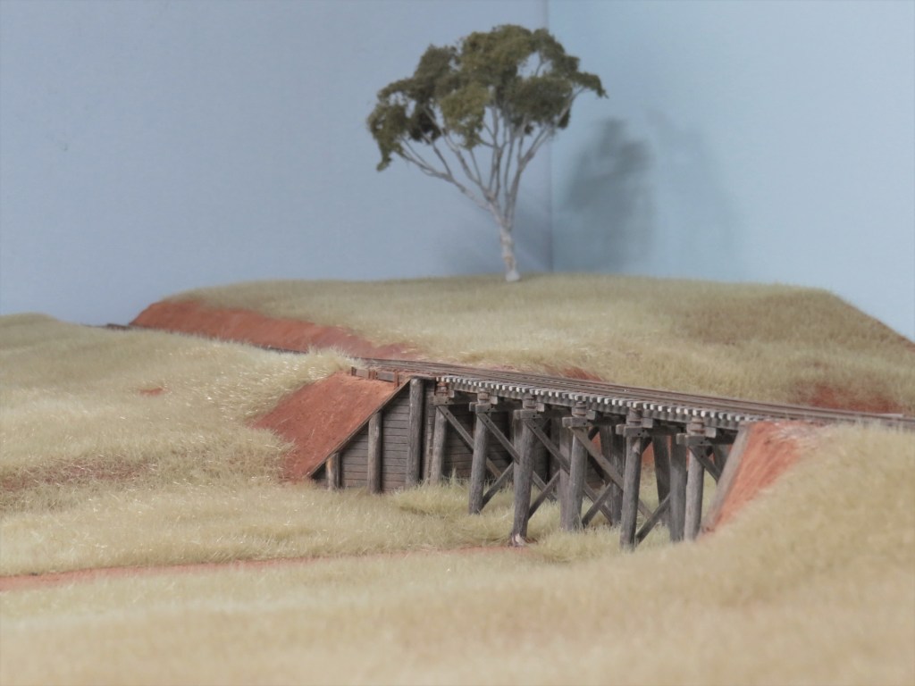 It may be noticed that beneath the trestle the grass is not flat well that is because the static grass was glued to clear plastic let dry and then peeled away from the plastic and cut to size and will bed down after I am happy with the way it looks.
