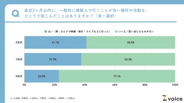 調査結果によると、直近3カ月以内にソロ活を経験した人の割合は、Z世代で41.1%、Y世代で37.7%という結果になりました。