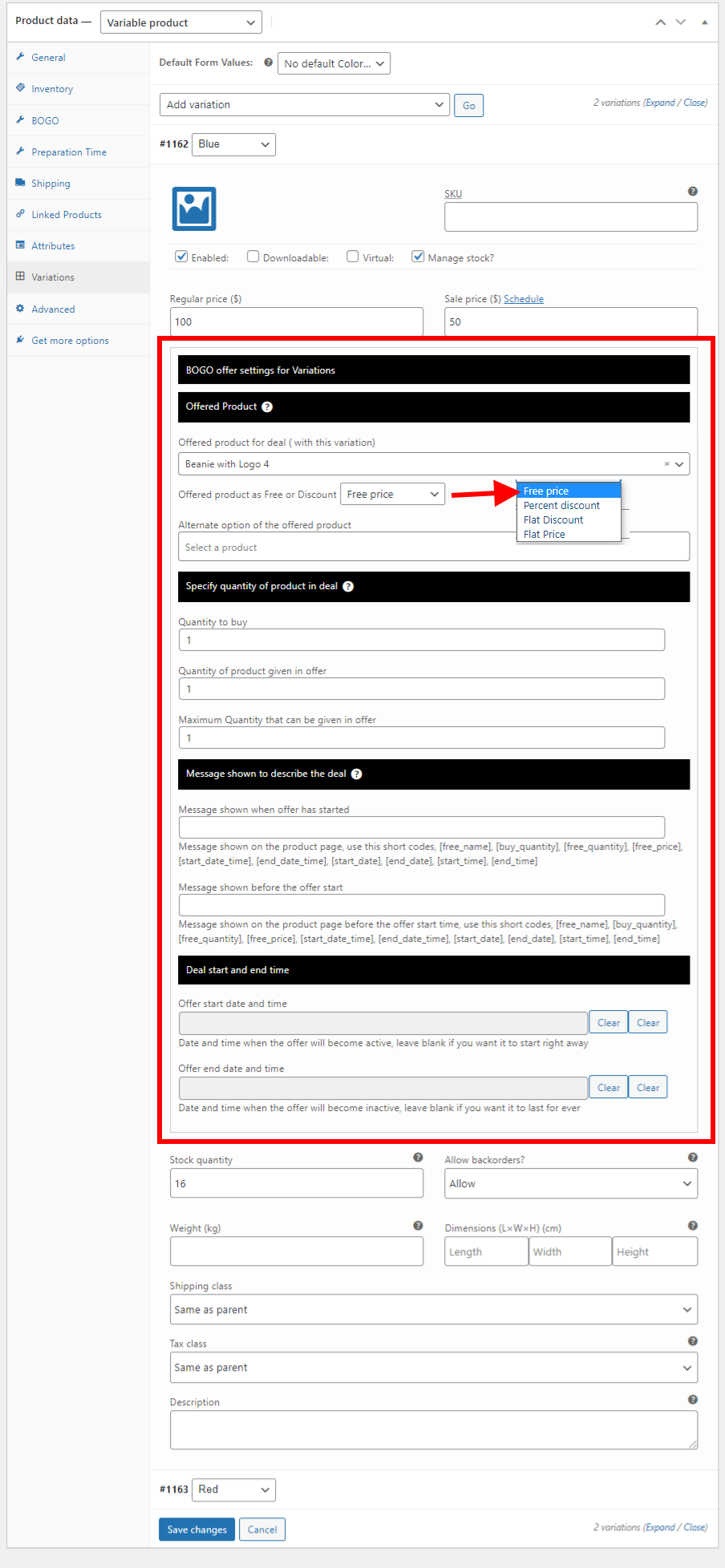 I want to offer Bogo deal for only few of the variations for a variable product