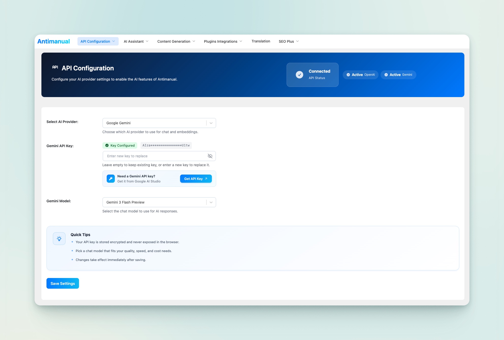 Use your own API key — we don’t charge for it. Antimanual works with your own OpenAI or Google Gemini API key. Both providers are supported in the free version, so you stay in full control of your AI usage and costs.