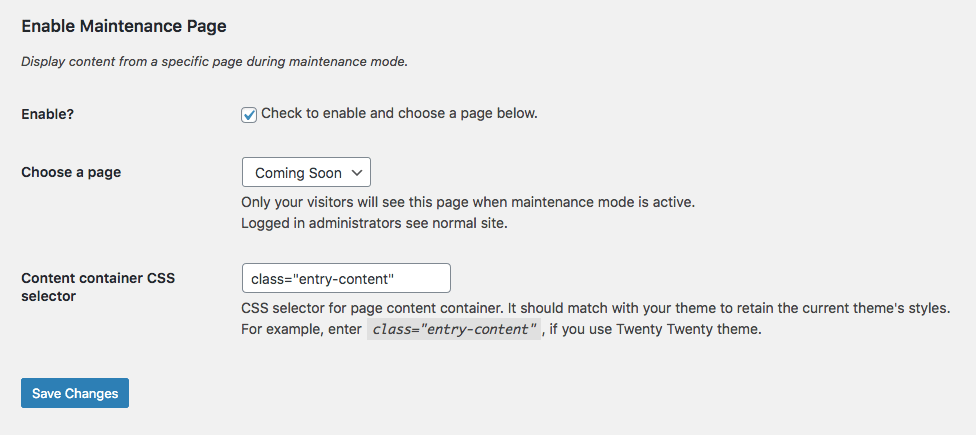 - Visit the settings to enable maintenance mode and choose a page from Dashboard > Settings > Reading > Enable Maintenance Page