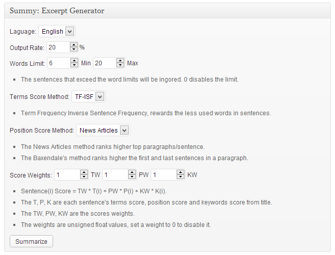 Summy generates excerpts for your posts by applying various algorithms for automatic summarization extraction.