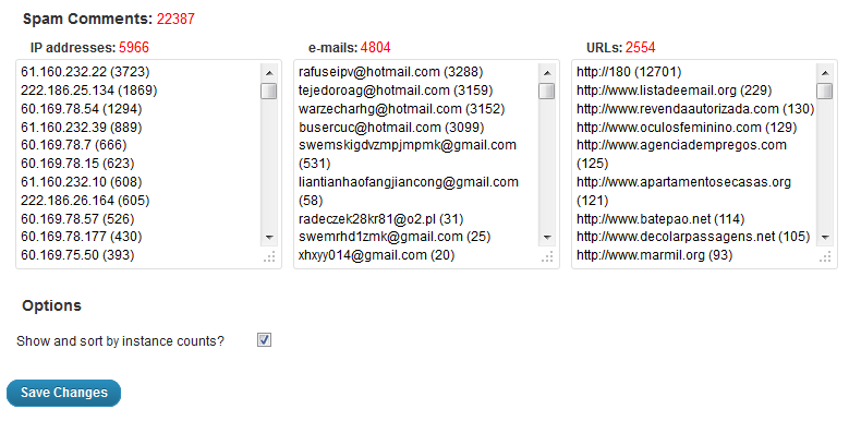 This plugin creates an admin paged called Blacklist under the Settings menu that contains 3 text boxes which are automatically populated with lists of all the IP addresses, urls, and email addresses of comments marked as spam. These lists can also be sorted by instance number, making it easier to identify the worst offenders.