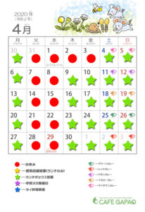 取り急ぎ4月と5月の営業カレンダーを乗せておきます↓
