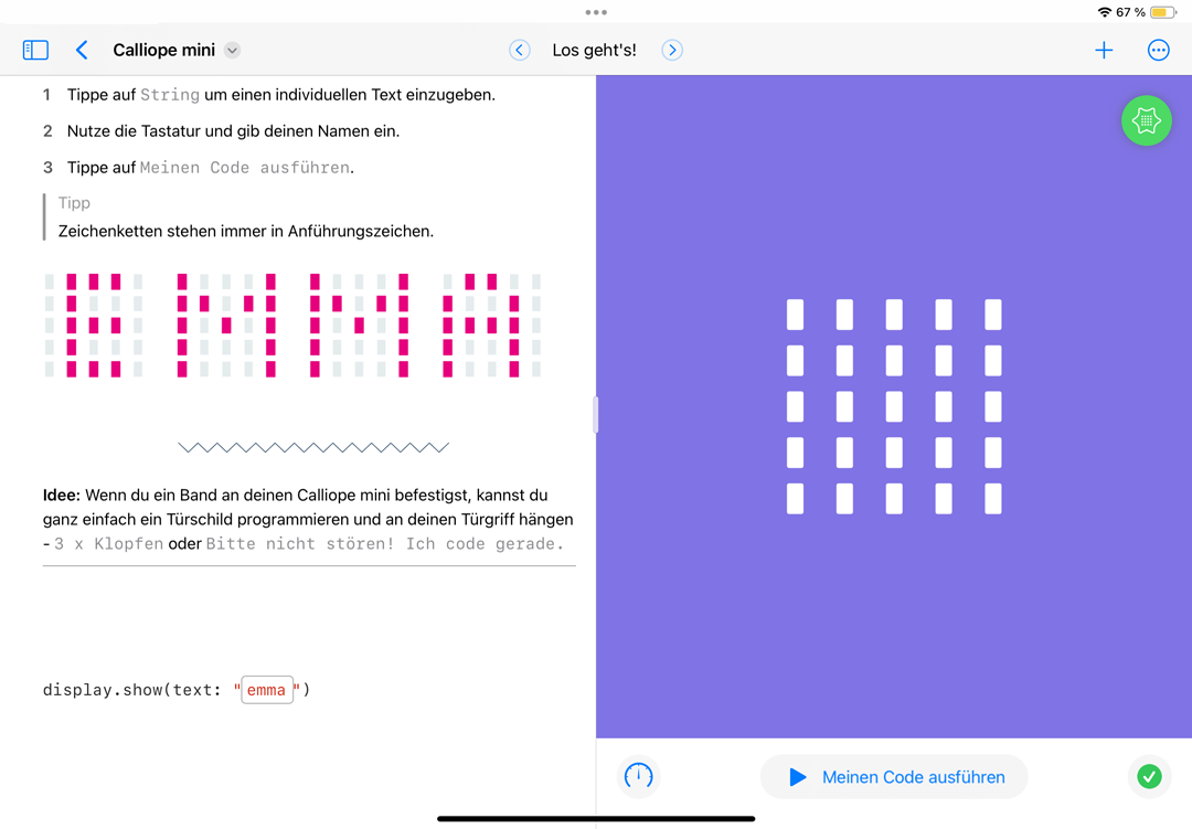 Der Calliope mini Swift Playground eignet sich zum Einstieg ins textbasierte Programmieren mit dem Mac oder dem iPad. Die Programmiersprache Swift wird in den ersten Kapiteln durch die Eingabe und Anpassung von Parametern leicht verständlich nahegebracht.