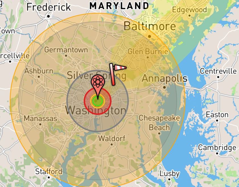 Simulated blast radius from a nuclear bomb launched at Washington, D.C.