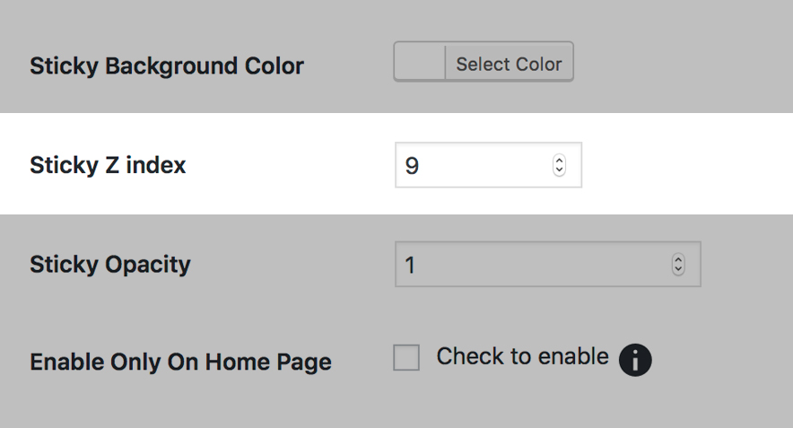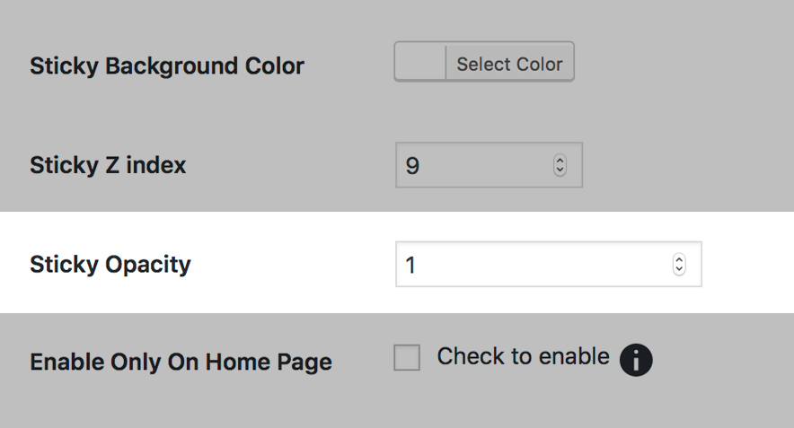 - click on the Catch Sticky Menu, There you can see options for " Desktop and Mobile Menu Selector #1","Sticky Background Color #2"," Sticky Z Index #3"," Sticky Opacity #4", "Enable Only On Home Page #5"