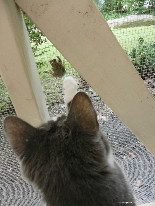 You just never know about the frogs around here. Some of them are poisonous.* So I ushered Mr. Frog outside the Catio into the great outdoors. Where Mr. Frog could carry on being a frog without further interference from this quarter.