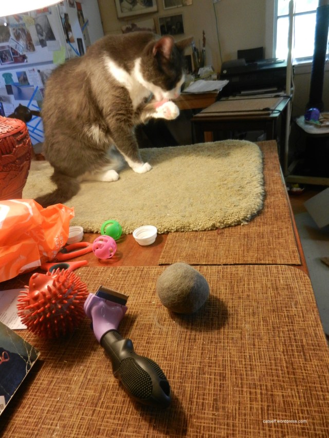 Here is Our Ball, ensconced in its new home. I’m happy to think of us in such good company. I especially like that fluffy white one on the right there. That was contributed by a mutual friend’s dog.