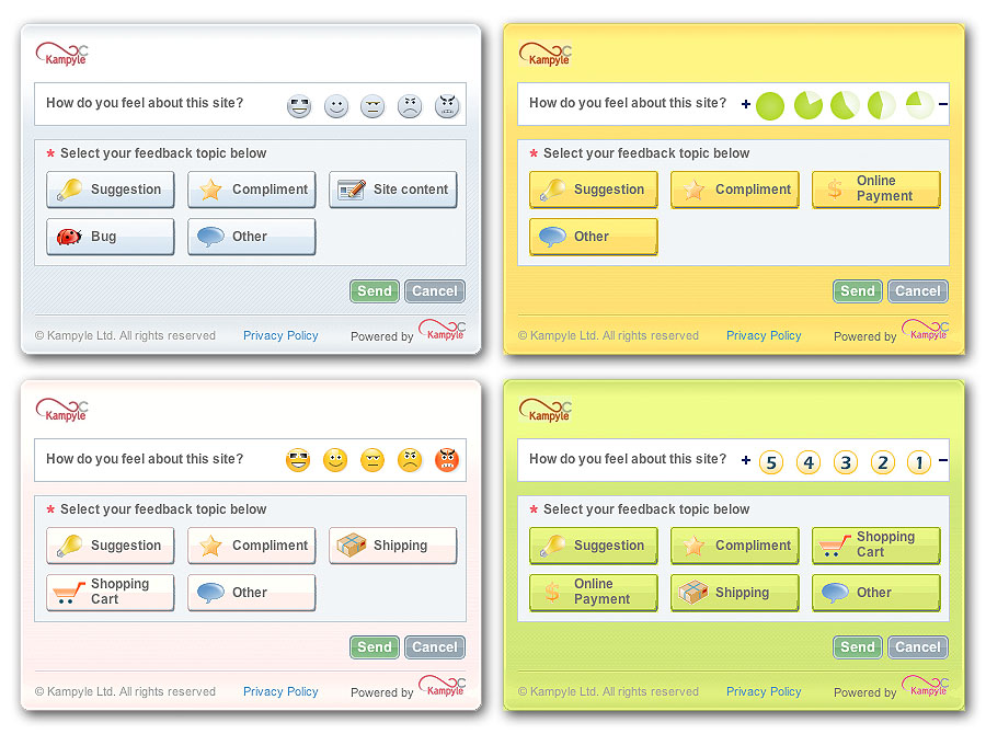 After registering on Kampyle.com, simply create your sleek feedback form, implement it, all in under five minutes. Visitors will then click on the attractive button on your site in order to leave feedback. Within Kampyle extensive analytics of the feedback will be at your hands.