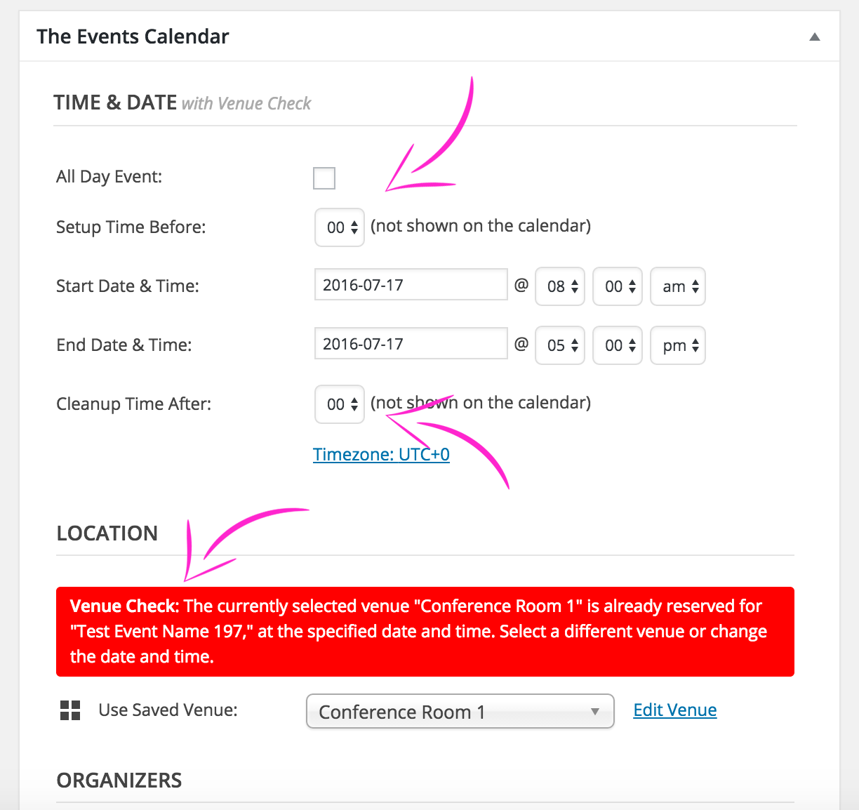 Venue Check will check for venue conflicts when adding an event. You can also include setup and cleanup time before and after the event. The setup and cleanup time will not display on the events calendar but will be included into the venue conflict checking.