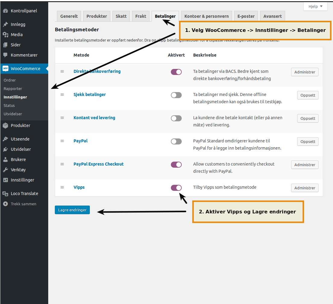 3. Go to the WooCommerce Settings page and choose Payment Gateways (Betalinger) and enable Vipps/MobilePay.