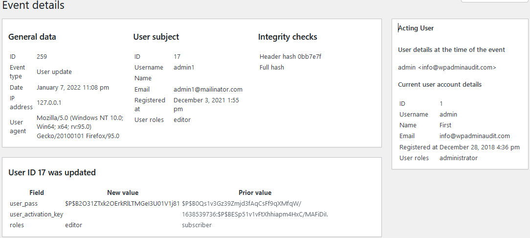 Example event: a user account was edited where the password was changed and the role was promoted from subscriber to editor