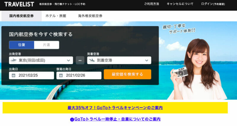 トラベリストは、国内外の格安航空券を一気に比較し、そのページ内ですぐに予約できるサイトです!