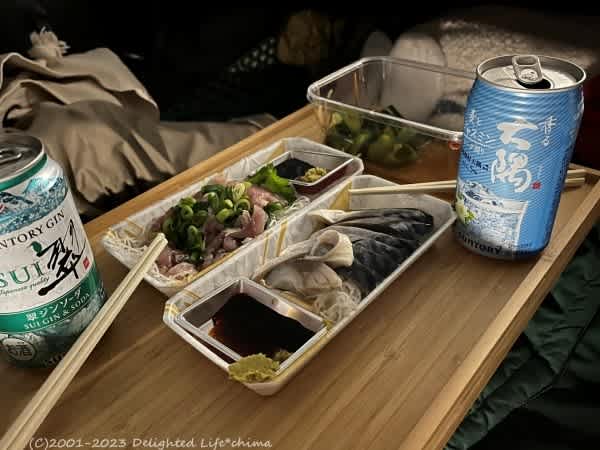 持参したお弁当で残ったおいなりさんや途中立ち寄ったスーパーで買ってきたお刺身などを肴に軽く1本飲んで爆睡。