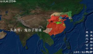紀元前209年、中国最初の統一王朝といわれる秦の時代の領土。チベットと新彊を除けば、この時代にほぼ現在の中国の形が出来上がったといわれている。それは領土だけでなく、貨幣や度量衡、漢字などのあらゆるものが統一されたからでもある。日本にはまだ国家らしい国家さえ無い時代である。日本がまだ狩猟採集を行っていた時代に、中国ではすでに数千年の歴史を持つ文化と、漫画『キングダム』で描かれるような数十万人規模の大きな戦いが中国各地で行われていたのは驚きである。