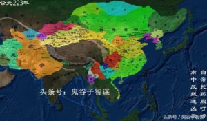 西暦223年、三国志の時代になると、北の匈奴が謎の民族、鮮卑に変わっている。強大な勢力であるが、この民族の詳しいことは殆ど分かっていない。子供のころ、横山光輝『三国志』を読んで心を躍らせた時代の実際の領土はこのような感じであったと知って感慨深いものがある。ちなみに、蜀の最大版図はもう少し大きい時代もあった。ちなみに、日本は卑弥呼の時代であるが、所在地もまだわかっていない謎の時代である。