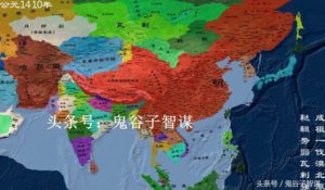 西暦1410年、明の時代の領土。国土が小さくなったように錯覚するが、世界基準で見ると超大国である!明といえば中国全土を統一した久しぶりの漢民族王朝であるが、北虜南倭に悩まされた、ぱっとしない国的なイメージがある。実際に、ひどい皇帝が多くて、宦官政治もひどかったという事もあるが、逆に鄭和の大航海や、一般社会では商業が大いに発達した時代でもあった。それまでの中国は重農主義の国家であったが、このころから商業が活発化している。しかし、産業革命を経た西欧列強には結局あらがえなかったのであるが。