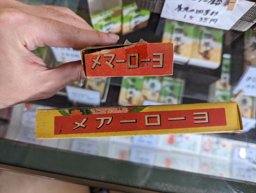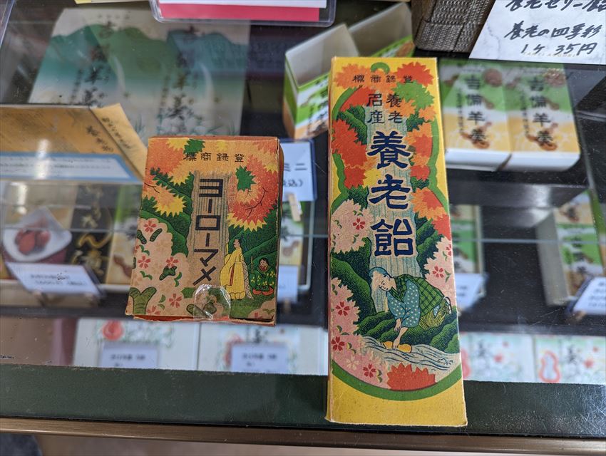 その養老豆、あとは養老飴という商品もあって、歴史とかいろいろ聞いてたら「こういう昔のデザインも残ってるのよ!」と、昔のパッケージも見せてくれました~~。
