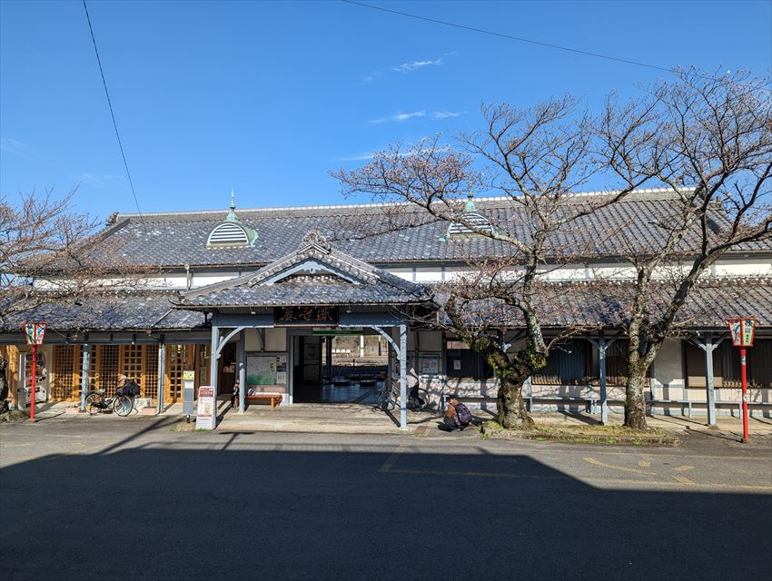 きび羊羹本家の正面に今も駅舎は、どっしりとした姿で佇んでいますが、二層の瓦でガッシリとした造りとなっており伊勢湾台風のときもビクともしなかったそうです。