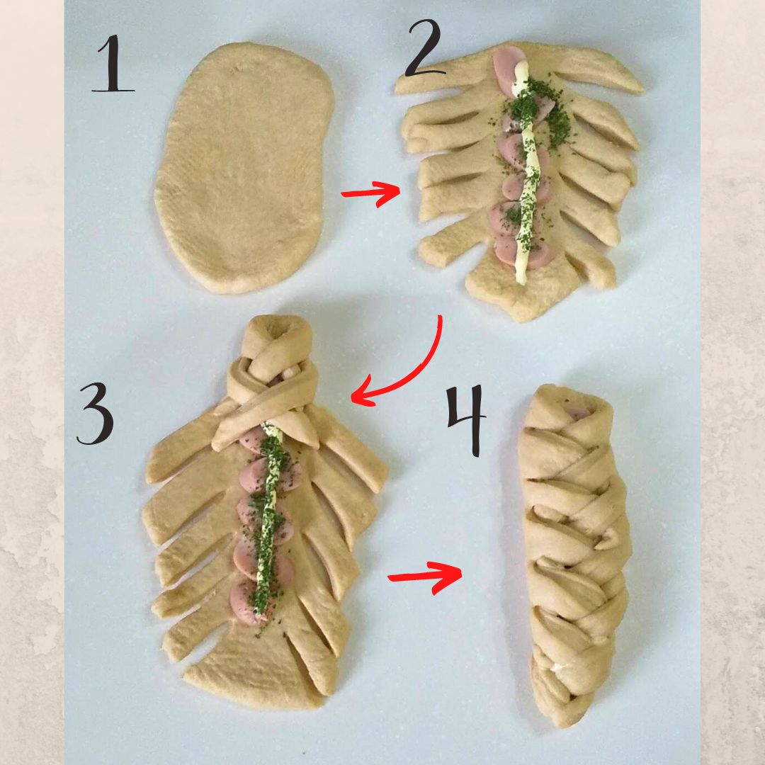 - 生地の真ん中に魚肉ソーセージ、マヨネーズ、パセリをのせて、左右対称に切れ込みをスケッパーで入れる