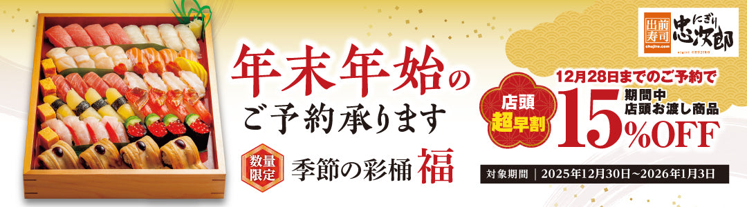 お近くの「にぎり忠次郎」へお電話していただき、宅配の場合と同様に注文情報をお伝えください。