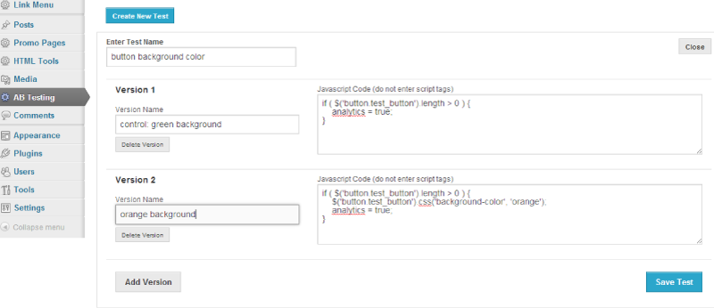 After you have installed the plugin, in the wordpress admin, navigate to AB Testing and click Create New Test. Enter Test Name, each test Version’s Name, and enter your custom javascript in Version Code and click Save Test. Be sure to include your analytics=true flag in all of your test version code snippets.