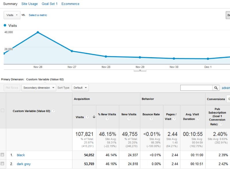 Here’s further reading about Google Analytics Custom Variables, Analytics Events, and Analytics Goals.