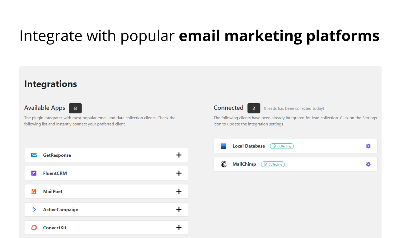 Once you activate the plugin, it will be automatically integrated with your local database. If you want to add your preferred email marketing solution, navigate to your WordPress Admin dashboard > Easy Email Integration > Integrations. You can select your email platform here. Next, navigate to any post or page where you want to display the contact form and add the form using Gutenberg or Elementor block editor. That’s it! You’re ready to get started with the lead collection.