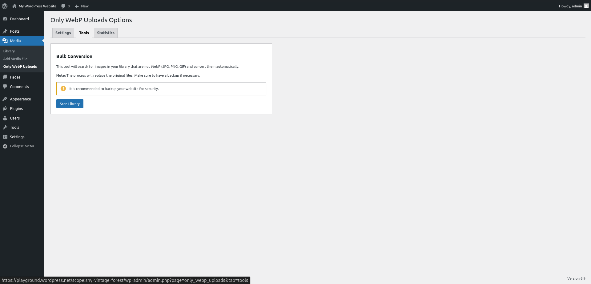 /wp-content/plugins/only-webp-uploadsdirectory, or install the plugin through the WordPress plugins screen directly. - Activate the plugin through the ‘Plugins’ screen in WordPress.