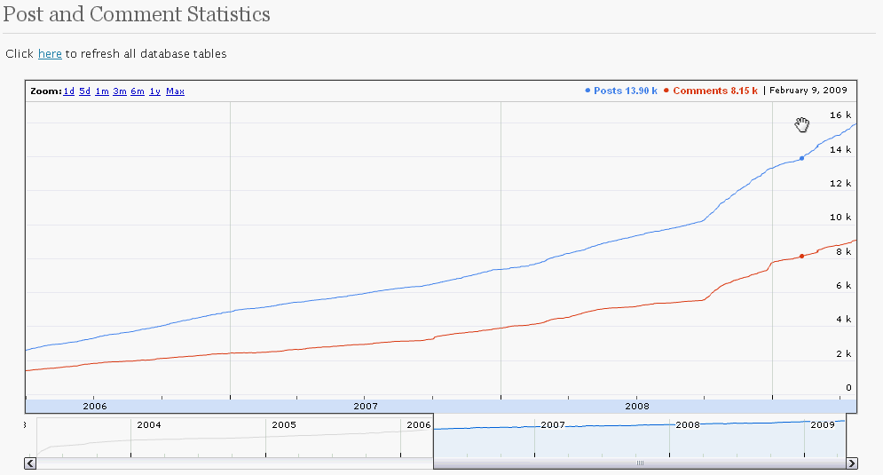 This plug-in is a reporting tools for site administrators in WordPress MU. It generates a histrogram graph of posts and comments population in the system. Google Data Visualization API tool is used here to generate the graph.