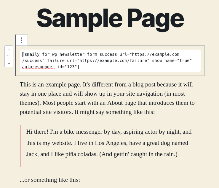 - You can choose a page to return in case of successful subscription by providing success_url attribute to the shortcode. [smaily_for_wp_newsletter_form success_url=”http://www.example.com/?page_id=2″]