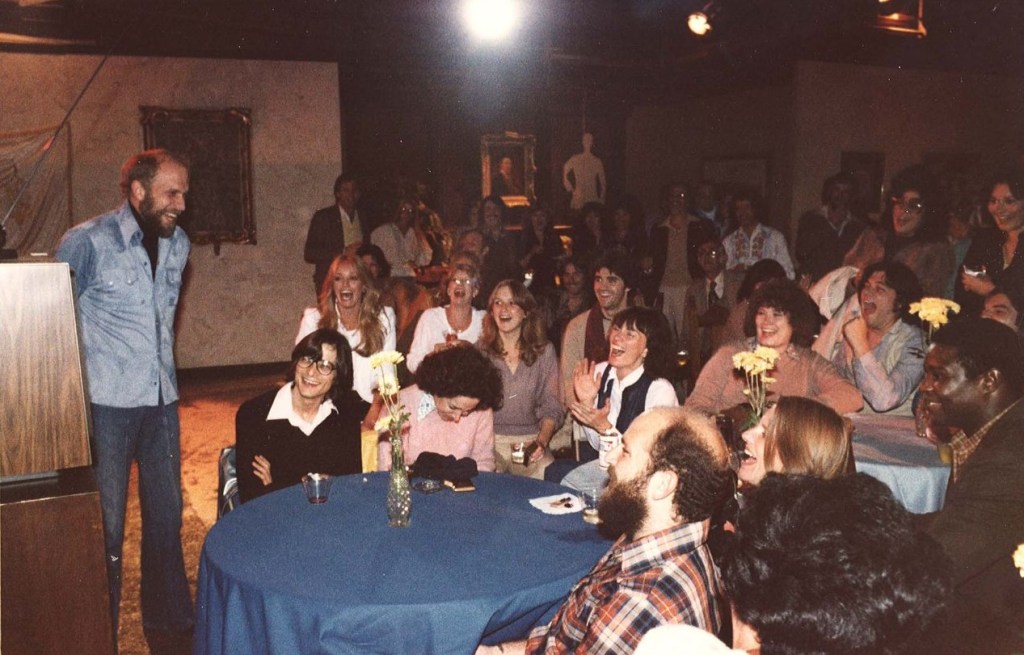 A new start seemed in order, and Taylor found it, at last, in television, on the staff of Cliffhangers, an ambitious but doomed weekly omnibus of three adventure shows structured in the style of old movie serials, from Bionic Woman creator Kenneth Johnson. “When I created the pilot for Cliffhangers I invited 17 fledgling writers to come a look at it and I ended up hiring 15 of them,” Johnson told me via email. “It was her first writing gig. She was a dear heart and a wonderful colleague.” Susan Anton, one of the stars of Cliffhangers, is visible in the production staff photo below (taken on February 27, 1979, the night of the premiere on NBC; courtesy Kenny Johnson), but it’s Jeri Taylor, right in the center, applauding, who catches your eye.