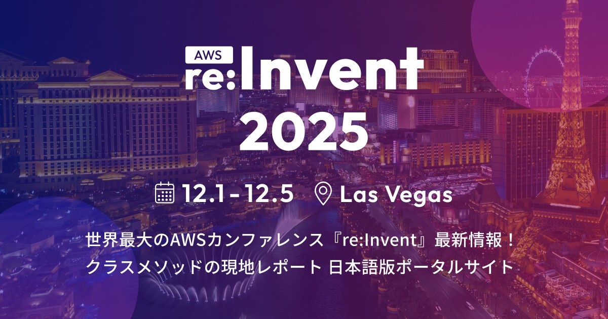 12月1日から米国ラスベガスで開催されるAWS主催のグローバルカンファレンス「AWS re:Invent 2025」について、クラスメソッドは最新情報を日本語でご紹介するポータルサイトを公開しました。