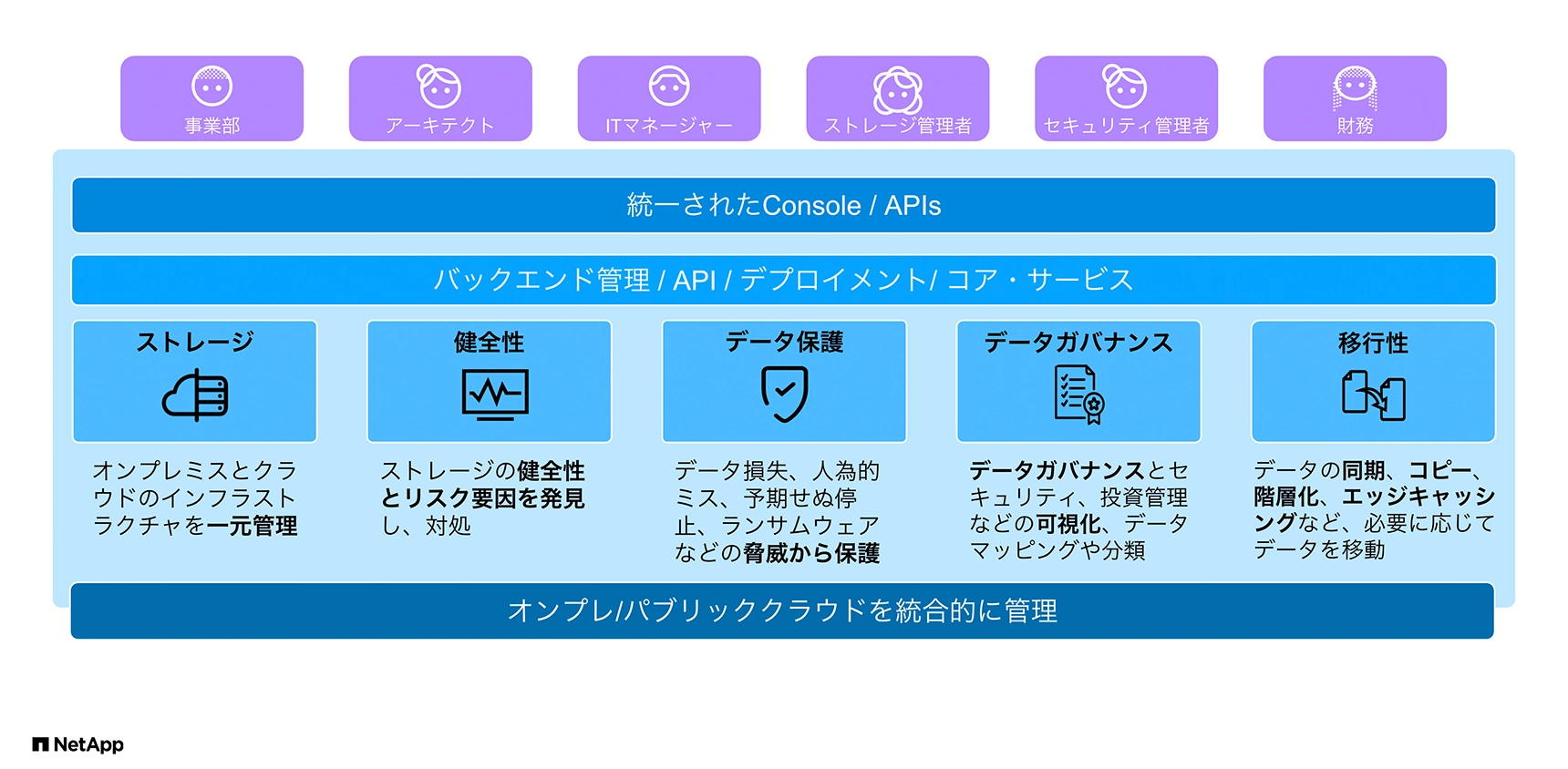 必要なストレージの容量を仮想化し有効活用できるプロビジョニングやオーケストレーションツールとして、クラウド環境の可視化や統合管理(データの移動やコピー、保護、分類・階層化など)が可能です。