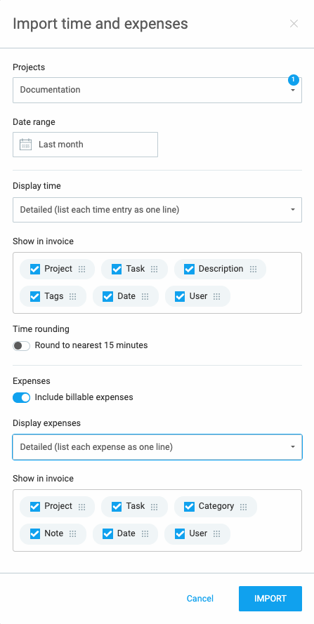 As a result, all time entries/expenses matching the selected date range and project/task will be imported.