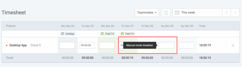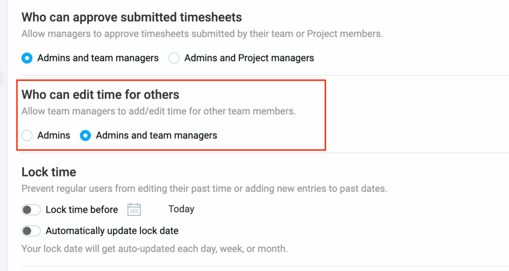 Team managers, along with admins, can add or edit time entries for their team members if enabled in Workspace settings.
