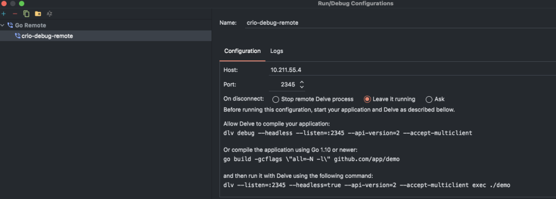 dlv --listen=:2345 --headless=true --api-version=2 --accept-multiclient exec bin/crio4、 在IDEA中配置go remote地址