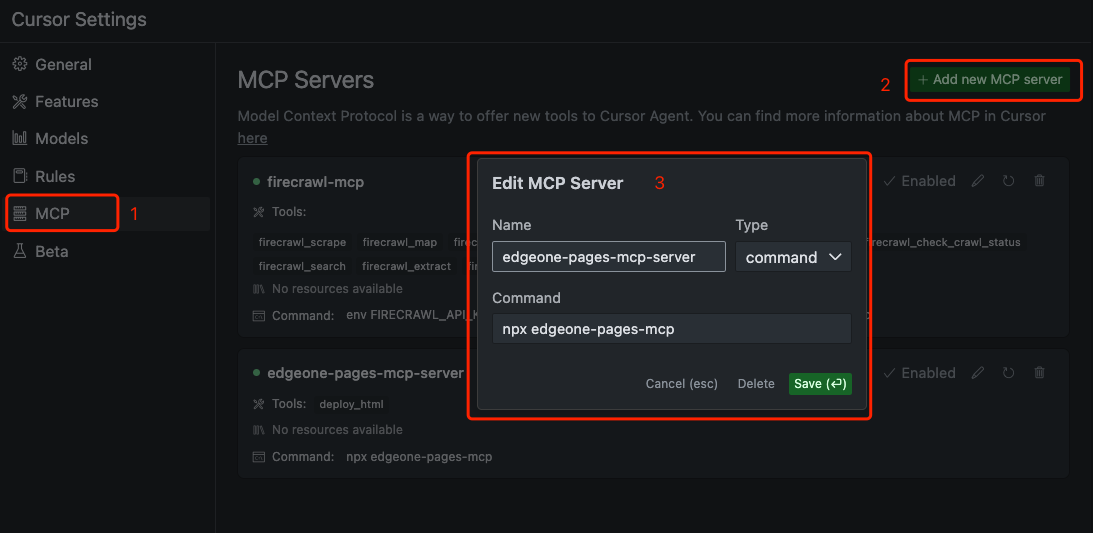 接下来以上面演示的 Cursor 为例,向大家介绍如何将 Pages MCP Server 集成到编辑器里面。