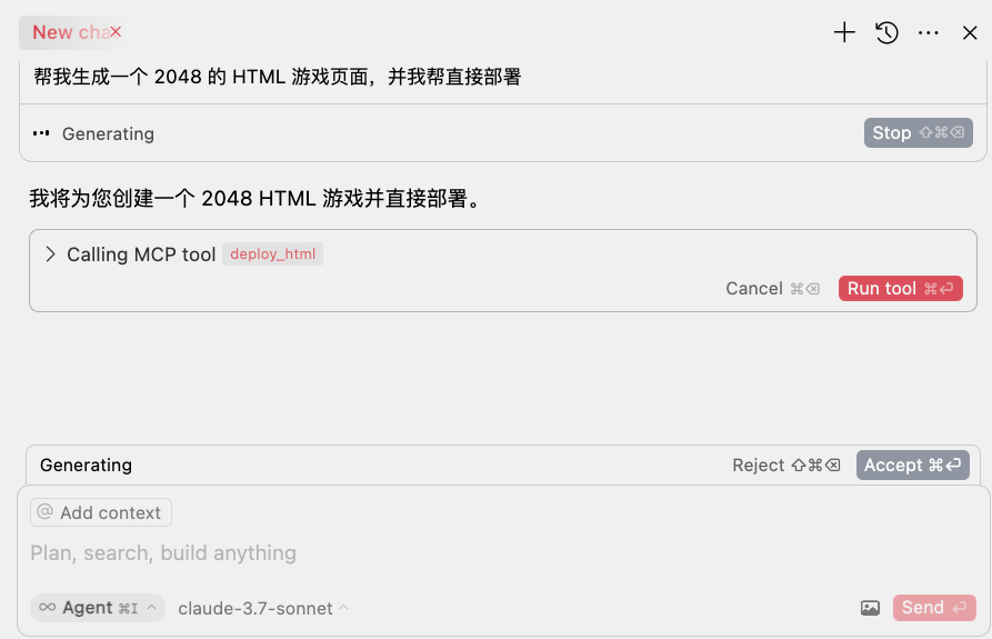 配置完后,在对话框输入您的需求,同时遵循类似的格式(帮我生成一个 xxxx 的页面并帮我直接部署),即可快速生成并部署。