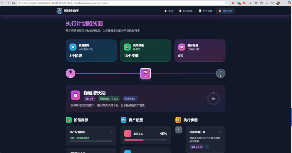 财务规划生成模块:根据用户的财务画像和基础信息生成用户专属的可视化财务规划报告,以下是工作流: 1. 数据解析与验证:接收并解析用户的财务画像和基础信息 2. 风险收益匹配:基于用户的风险承受度评分,确定目标年化收益率区间和可接受的最大回撤幅度 3. 资产配置设计:运用现代投资组合理论,设计包含现金类、固收类、权益类、另类投资的四维资产配置方案 4. 产品组合构建:为每个资产类别推荐3-5个具体的投资产品,包含费率、风险等级、历史业绩等关键信息 5. 分阶段执行计划:比如制定第一年基础建仓、第二年优化调整、第三年及以后进阶配置的三阶段实施路径 6. 风险控制机制:设计止损点、定期再平衡频率、市场异常情况应对预案等风险管理措施 7. 结构化报告输出:将所有规划内容整理为可视化结构格式,包含配置方案、产品清单、执行计划、风控措施等模块展示(可自行扩展) 8. 支持报告的word导出和pdf导出