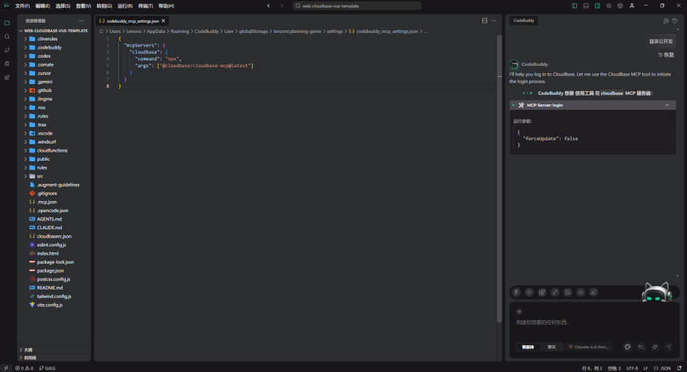 { "mcpServers": { "cloudbase": { "command": "npx", "args": ["@cloudbase/cloudbase-mcp@latest"] } } }