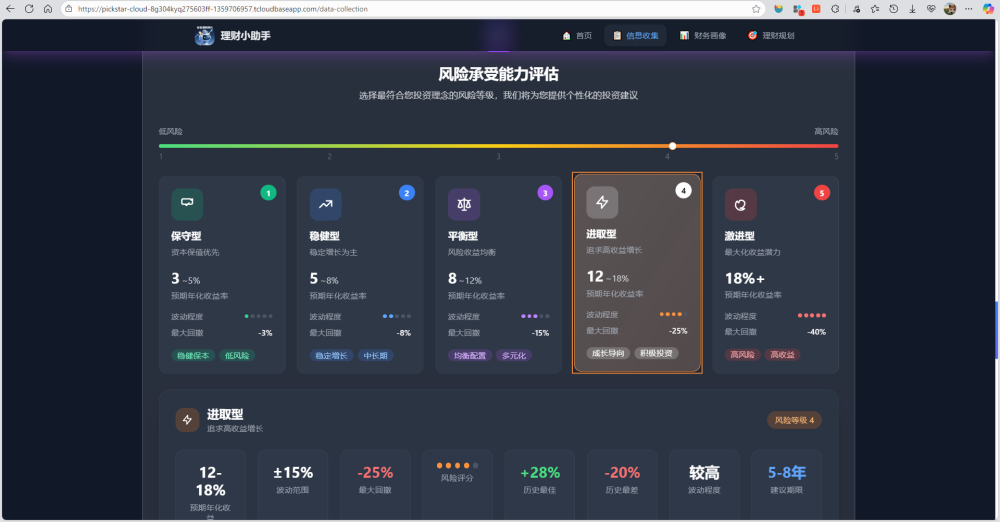 用户基础信息模块:建立用户财务档案,用户填写六大基本信息,均为必填信息,昨晚这一模块才能进行财务画像生成模块。 • 年龄阶段 📅 • 收支情况 💵 • 现有资产 🏡 • 负债状况 📝 • 风险偏好 🎢 • 理财目标 🎯