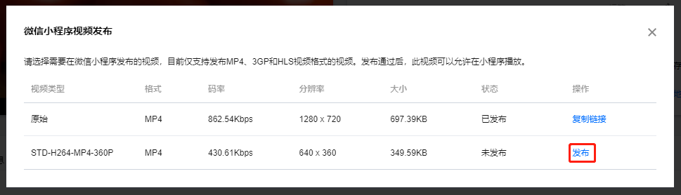 用户需要在媒资管理 > 视频管理> 微信小程序视频发布 内对视频进行发布。