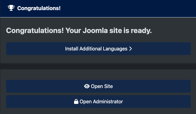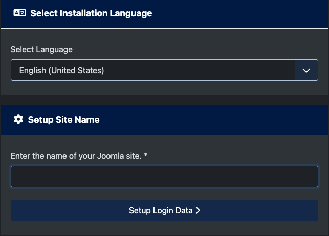 You will see the Joomla application. Select Select Language and Setup Site Name