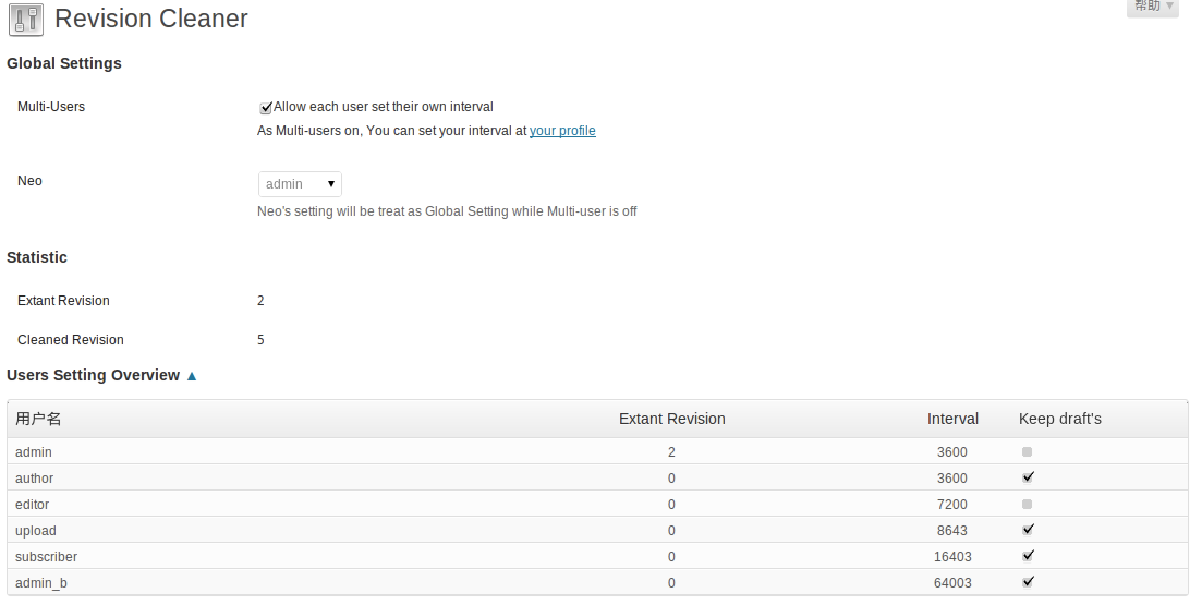 Revision is a very useful stuff when you experienced an unexpected power failure or keyboard got peed by your cat while you’re writing an article or just simply revise what you’ve wrote. After you’ve “finally” posted your article, the revisions, still consuming your SQL database as long as the database last. To save your database storage, wipe out the revisions is necessary and this is what Revision Cleaner do in AUTOMATICALLY and safely (won’t delete any draft 🙂 ). “Clean interval” setting support multiple-users, they can set their own clean interval (admin can control it and assimilated everyone of course).Email:wordpress(at)mengzhuo.org