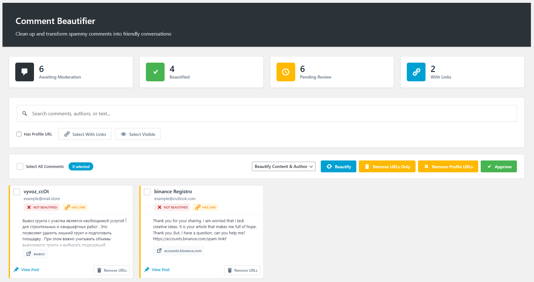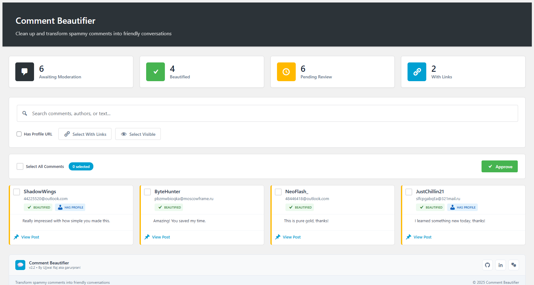 Comment Beautifier is a powerful WordPress plugin that helps website owners and moderators transform spammy, low-quality comments into genuine, engaging conversations. Instead of simply deleting suspicious comments, you can now convert them into valuable content that enhances your website’s discussion quality.