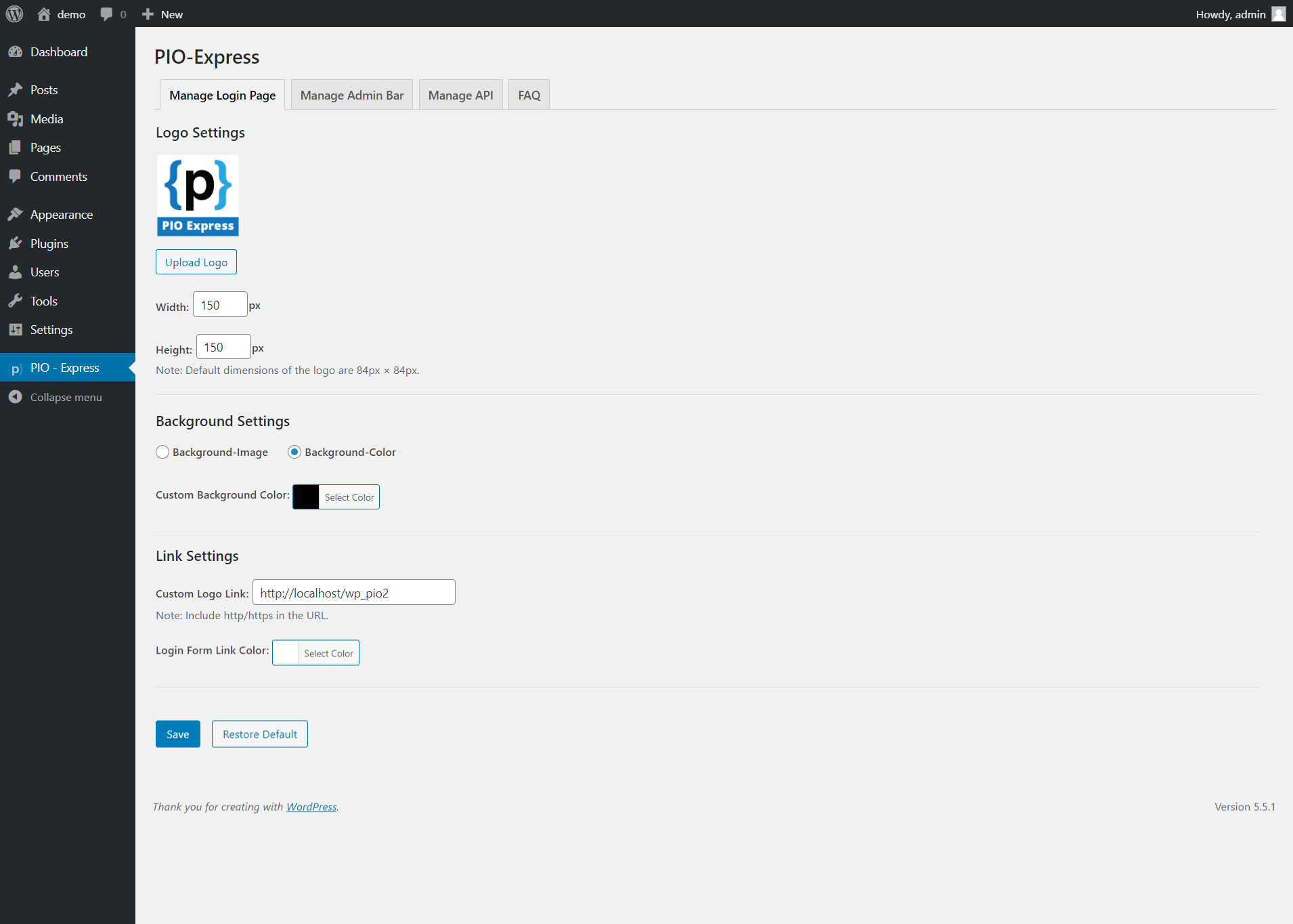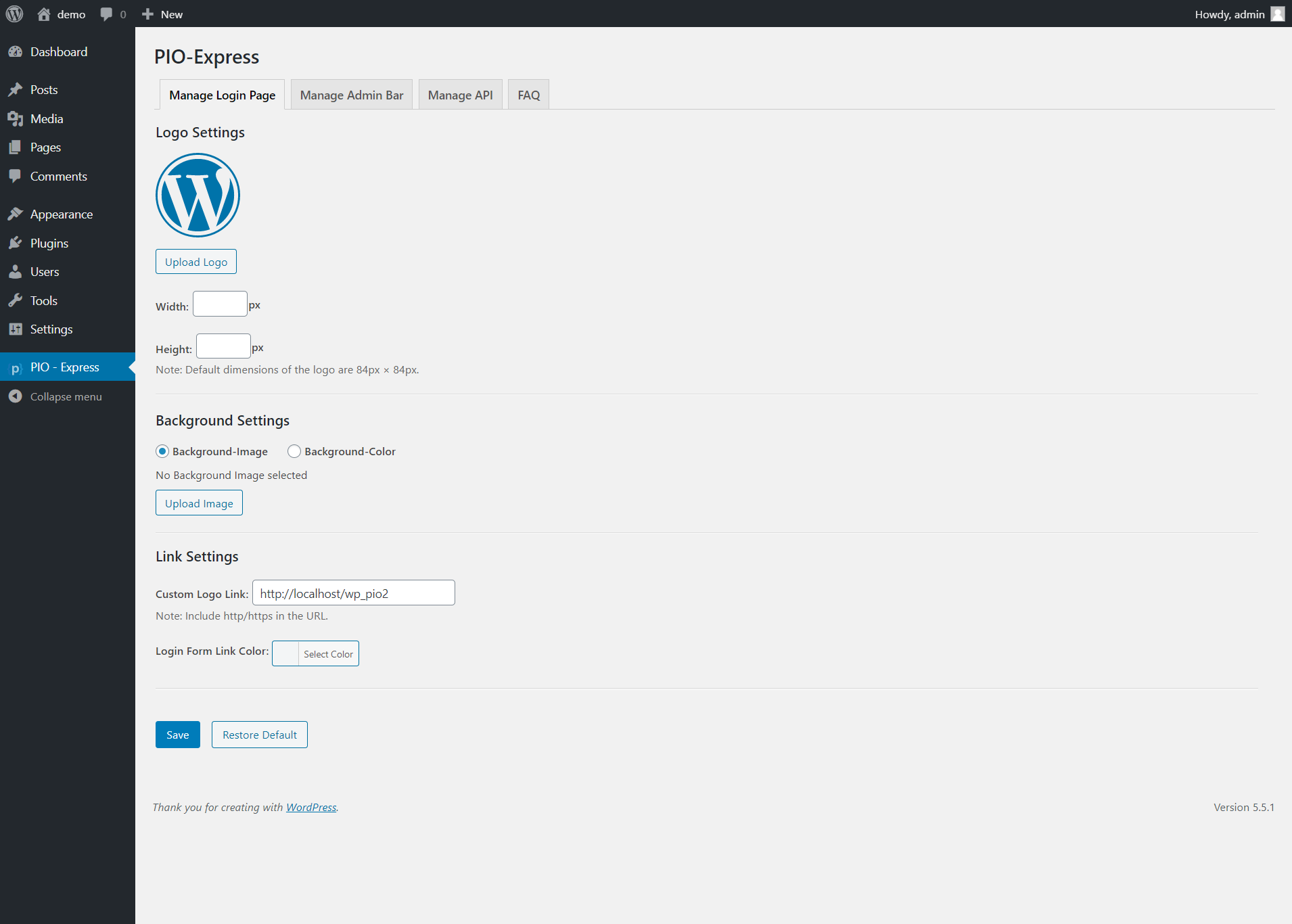 The PIO Express plugin provides a simple user interface that allows you to replace the WordPress logo on the login page with your own logo. It also allows you to specify the height and width of the logo to make sure there is no distortion. The plugin also al you to change the background of the wp-login page along with the logo link settings.